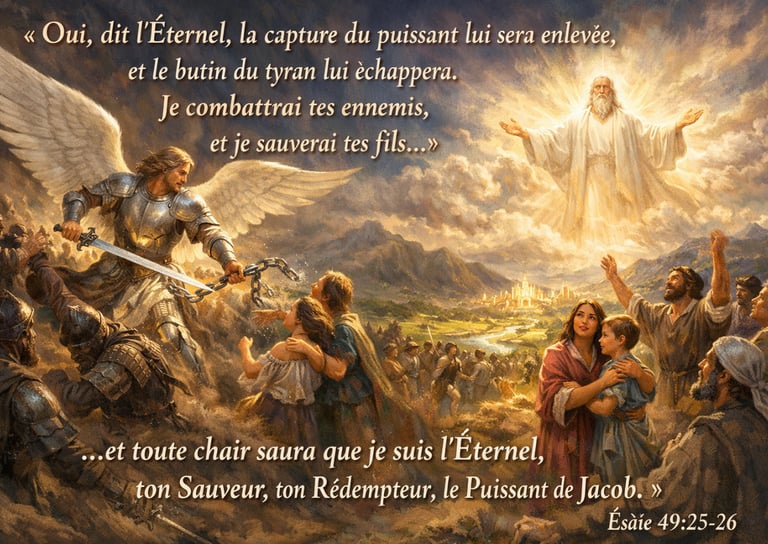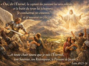 Verset de base : « Oui, dit l’Éternel, la capture du puissant lui sera enlevée, et le butin du tyran lui échappera. Je combattrai tes ennemis, et je sauverai tes fils… et toute chair saura que je suis l’Éternel, ton Sauveur, ton Rédempteur, le Puissant de Jacob. » Ésaïe 49:25-26
